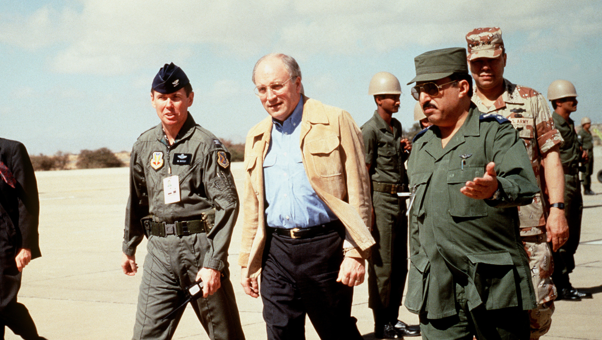 Photo Description: Secretary of Defense Richard Cheney converses with COL. Alton Whitby, commander, 37th Tactical Fighter Wing, and Brig. GEN. Abdul Aziz Bin Khalid Al-Sudairi, commander of Joint Forces, Saudi Arabia, as he and GEN. Colin Powell, chairman, Joint Chiefs of STAFF, walk along the airfield following their arrival for a conference. The men will be discussing U.S. military intervention against Iraq during Operation Desert Storm. 6 February, 1991